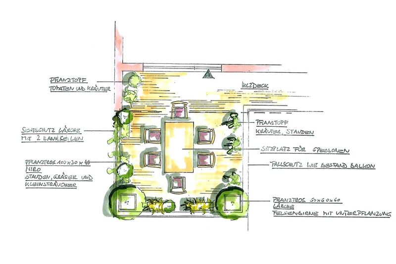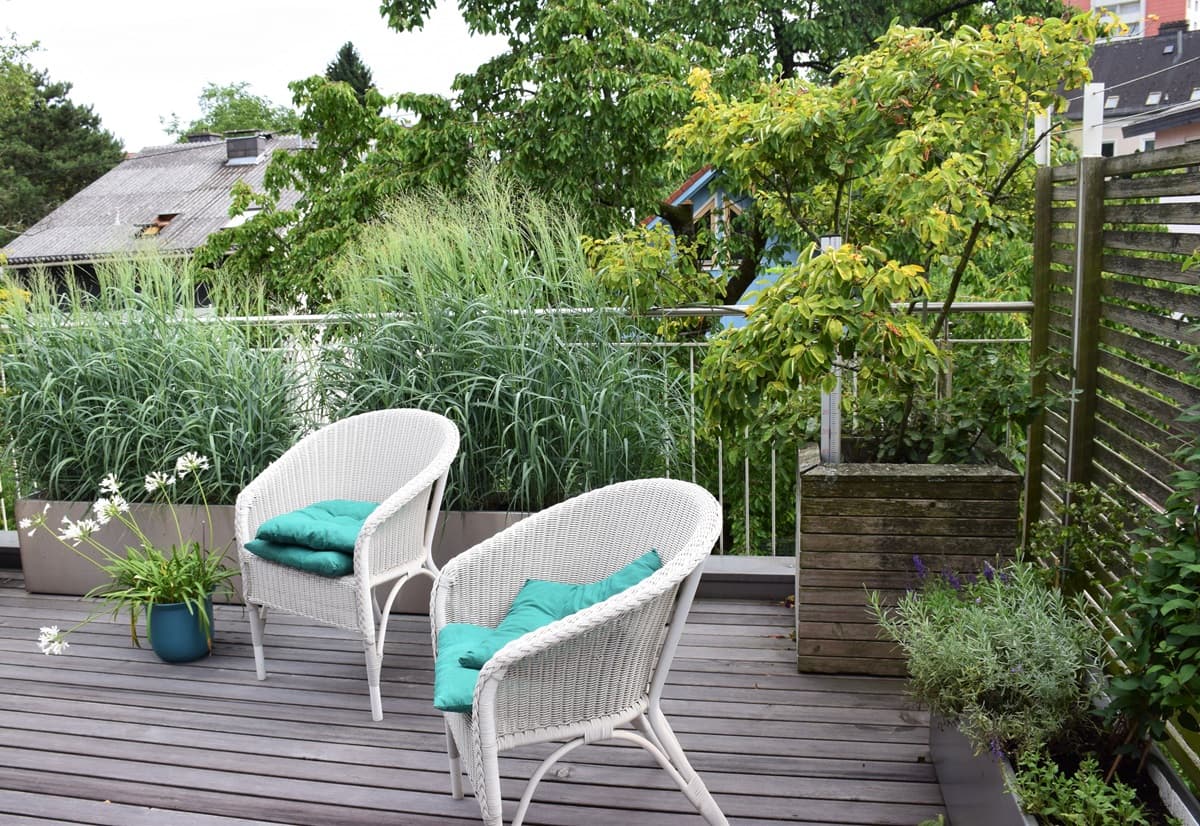 Als der Lärchenbelag der Dachterrasse erneuert werden musste, nutzte man dies zur Neugestaltung der Bepflanzung. Zwei Felsenbirnen in holzverkleideten Trögen blieben erhalten. Vier Edelstahltröge erhielten eine harmonische Bepflanzung aus Gräsern mit duftigen Ähren, Blütenstauden, Kräutern und Zwiebelpflanzen. Den benötigten Sicht- und Windschutz schafft die mit Clematis berankte Lärchenholzwand mit Rankseilen. Das Ergebnis ist ein gemütlicher Ess- und Arbeitsplatz im Freien, der ganzjährig attraktiv ist und mit wenig Pflege auskommt.