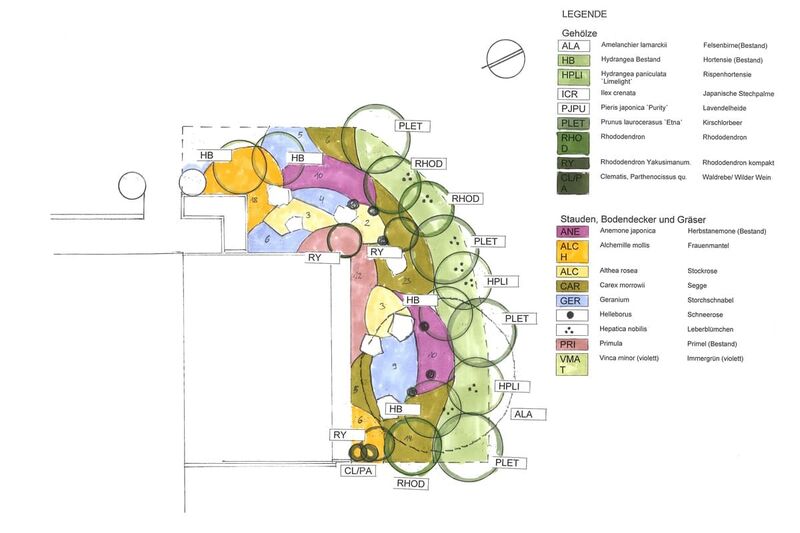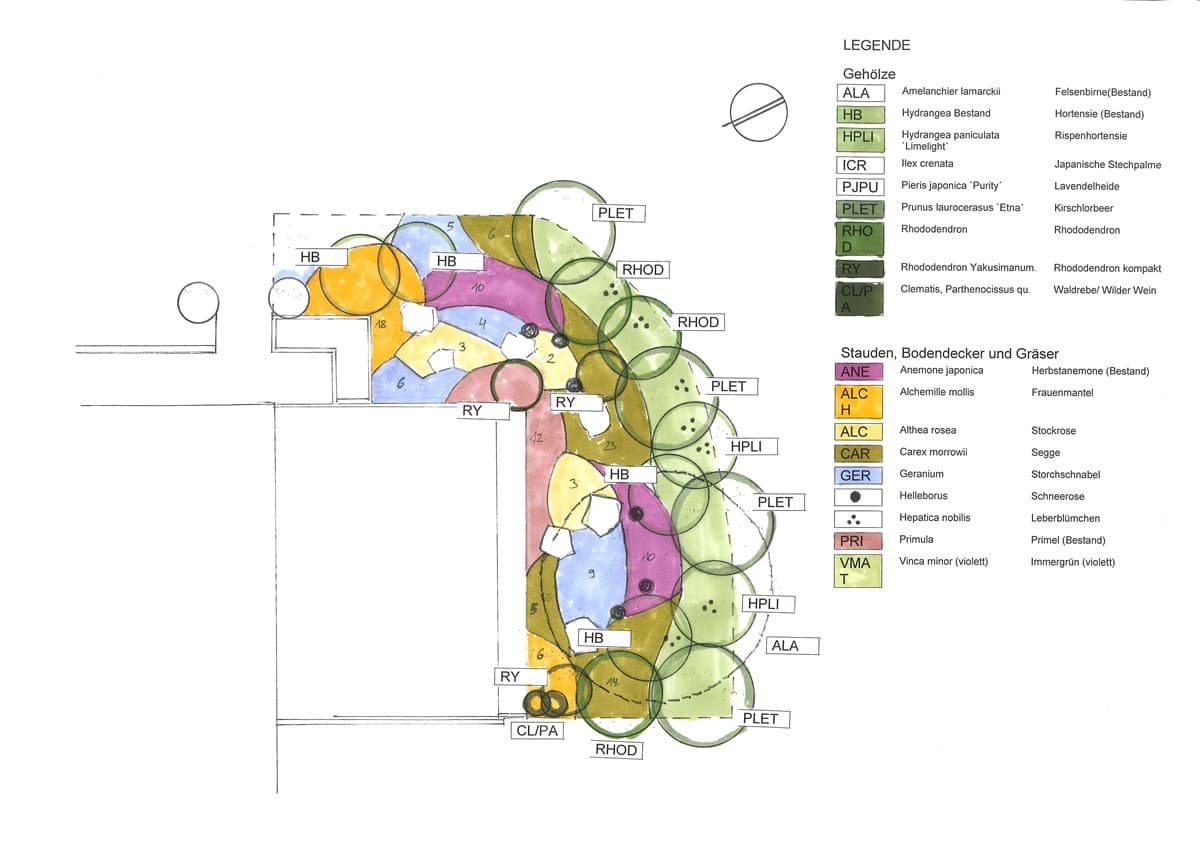 Ein kleiner Ferienhausgarten soll im Stil passend zum Salzkammergut gestaltet werden. Traditionelle Bauerngartenstauden, Hortensien und Rhododendren grenzen den Terrassengarten zur Gemeinschaftsfläche hin ab. Eine Felsenbirne sorgt für Sichtschutz und lichten Schatten. Die Terrasse wird durch ein Hochbeet für Erdbeeren und Kräuter und eine holzverkleidete Sitzmauer eingefasst. Zur Nachbarterrasse wird ein berankter Sichtschutz aus Holz und Niroseilen errichtet. Die Unterpflanzung aus Bodendeckern und immergrünen Gräsern bildet einen attraktiven und pflegeleichten Abschluss.