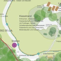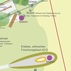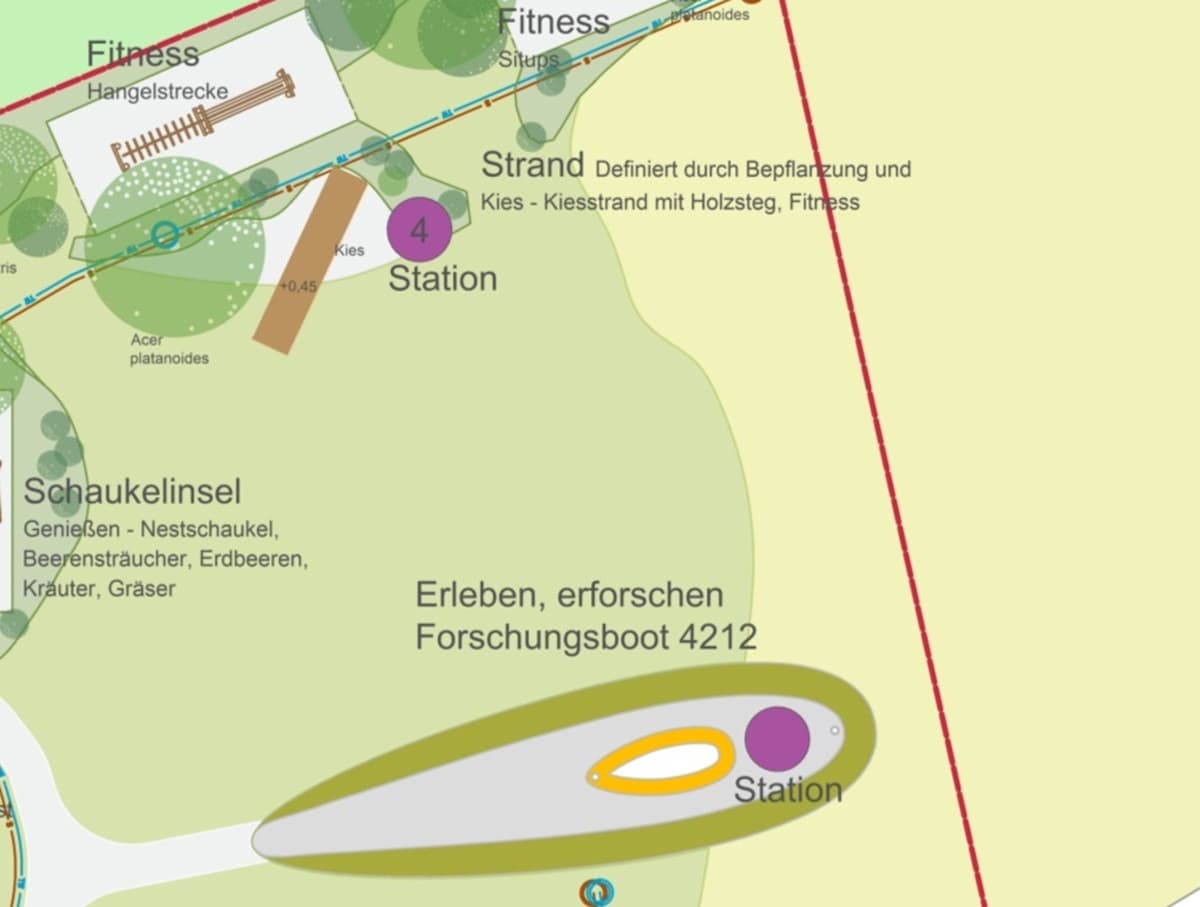 Begehbar ist der Freiraum über Kies-, Trittplatten- und Rasenwege, die die Küstenlandschaften mit den Inseln - Sandinsel, Liegeinsel, Naschinsel, Schaukelinsel - und dem Forschungsschiff verbinden. Geplant ist ein Rundweg mit fünf Stationen, die Informationen zu berühmten Naturforschern und ihren Schiffen bereithalten.