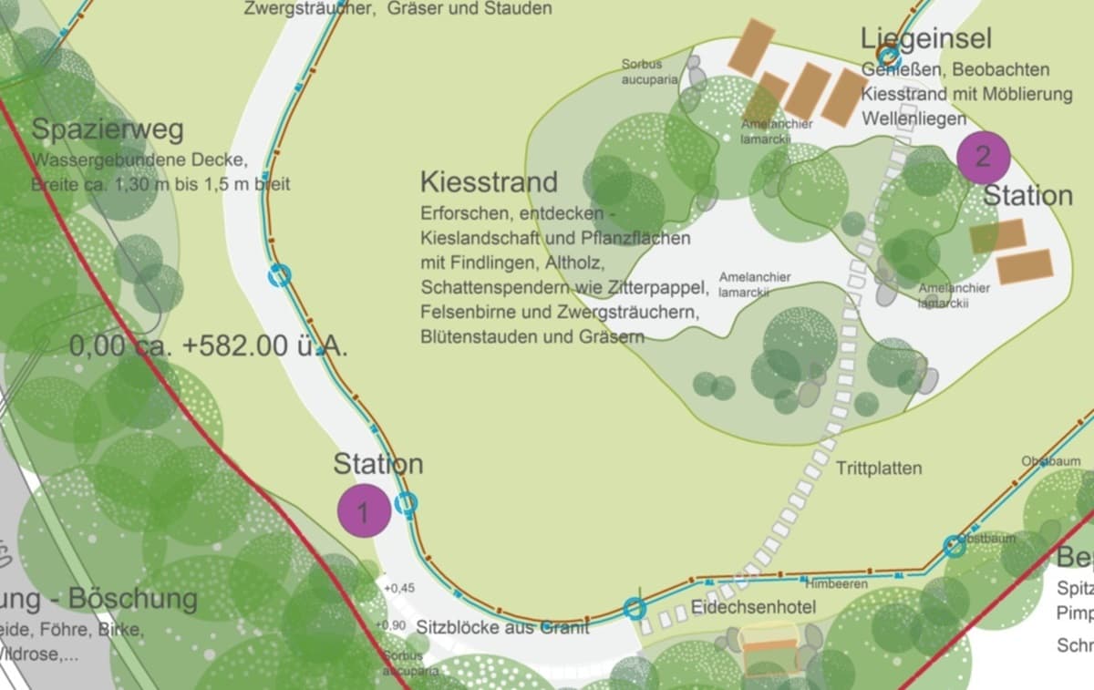 Im Bereich der Tunneleinhausung der S10 soll ein Freiraum entstehen, der Besucher*innen einen Raum zum Erleben, Genießen, Beobachten und Erforschen bietet. Wogende Wiesenflächen mit Inseln und Halbinseln, die den Themen Naschen, Ruhen, Genießen und Spielen gewidmet sind, lassen an eine Lagune mit Küstenstreifen denken. Das Forschungsboot 4212 bildet den markanten Orientierungs- und Identifikationspunkt und markiert den Übergang von der regelmäßig gemähten Wiese - der Lagune - zur einmahdigen Wiese - der offenen See.